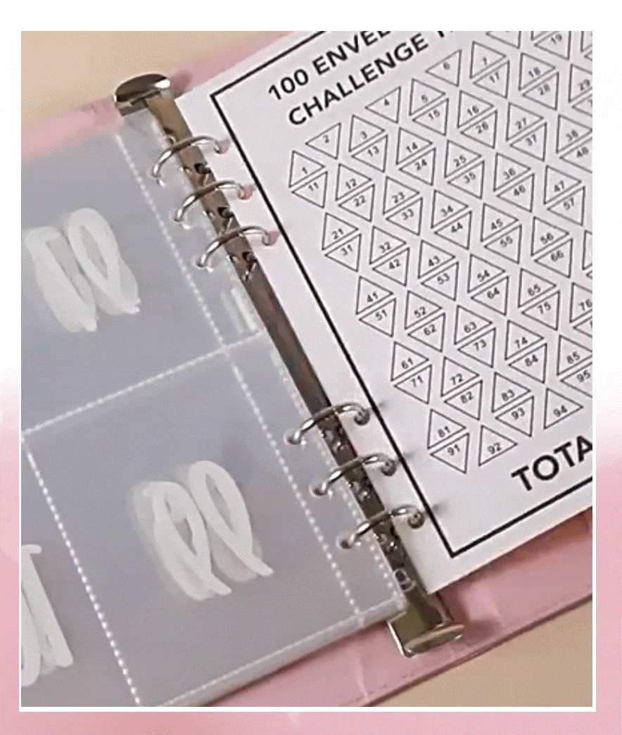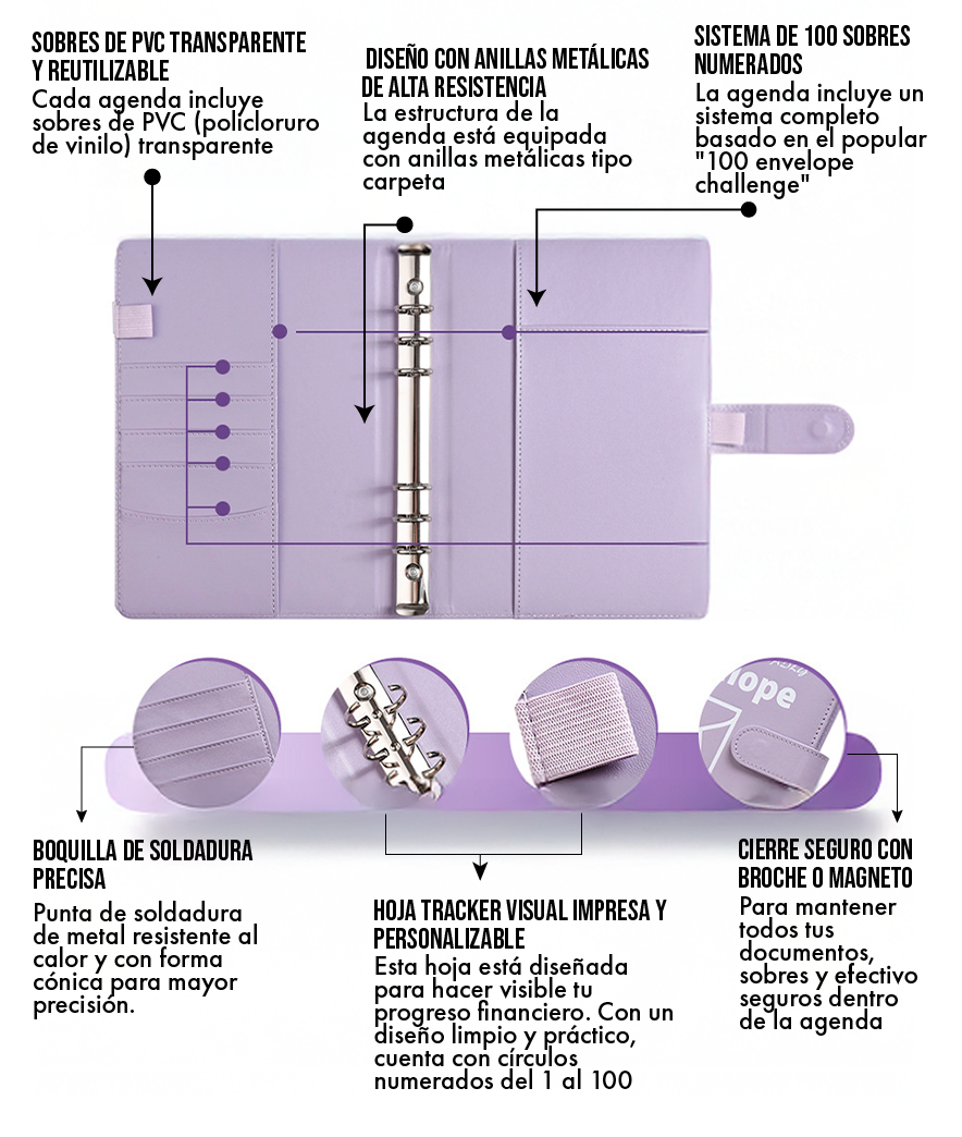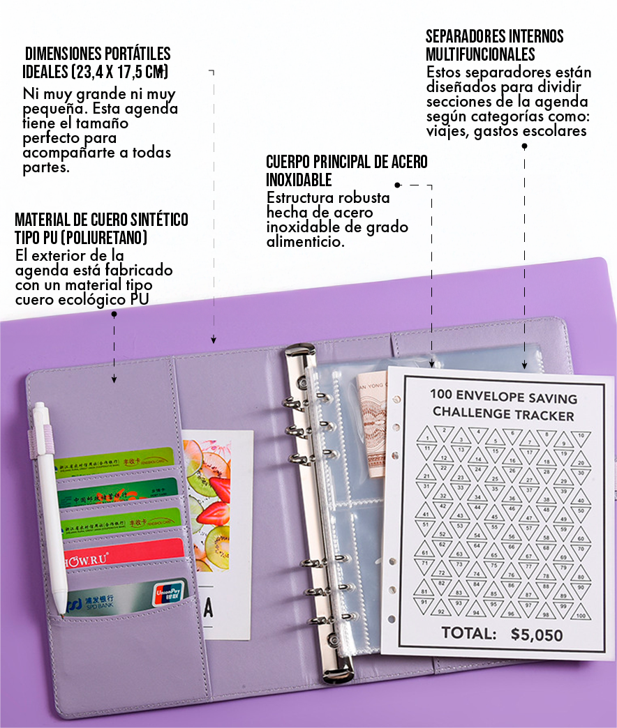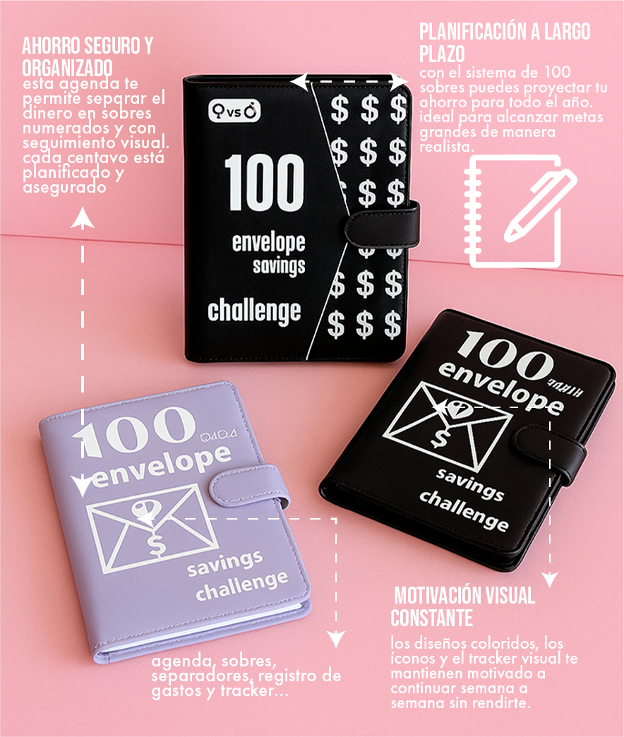 La agenda incluye 100 sobres numerados, separadores de categorías, registro de gastos, calendario de metas, y un tracker visual para marcar cada sobre completado.