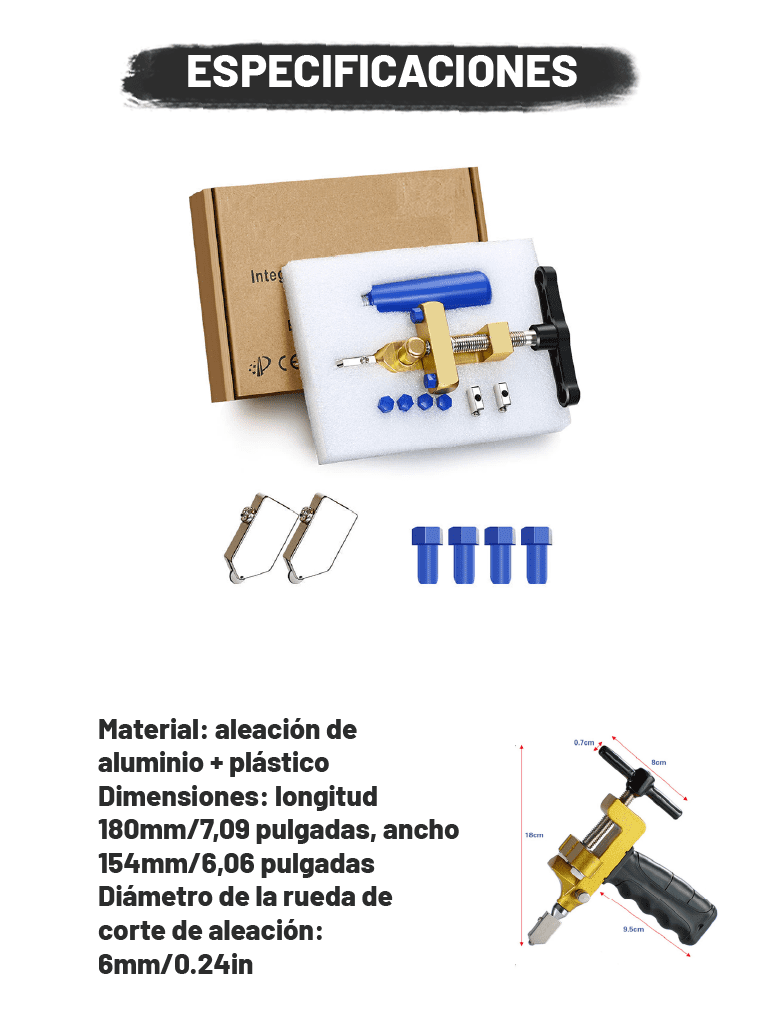 Sistema de presión ajustable para diferentes espesores. Ruedas de corte de tungsteno para mayor resistencia. Accesorios de repuesto incluidos. Empaque acolchado que asegura envío sin daños.
