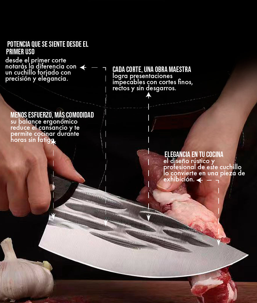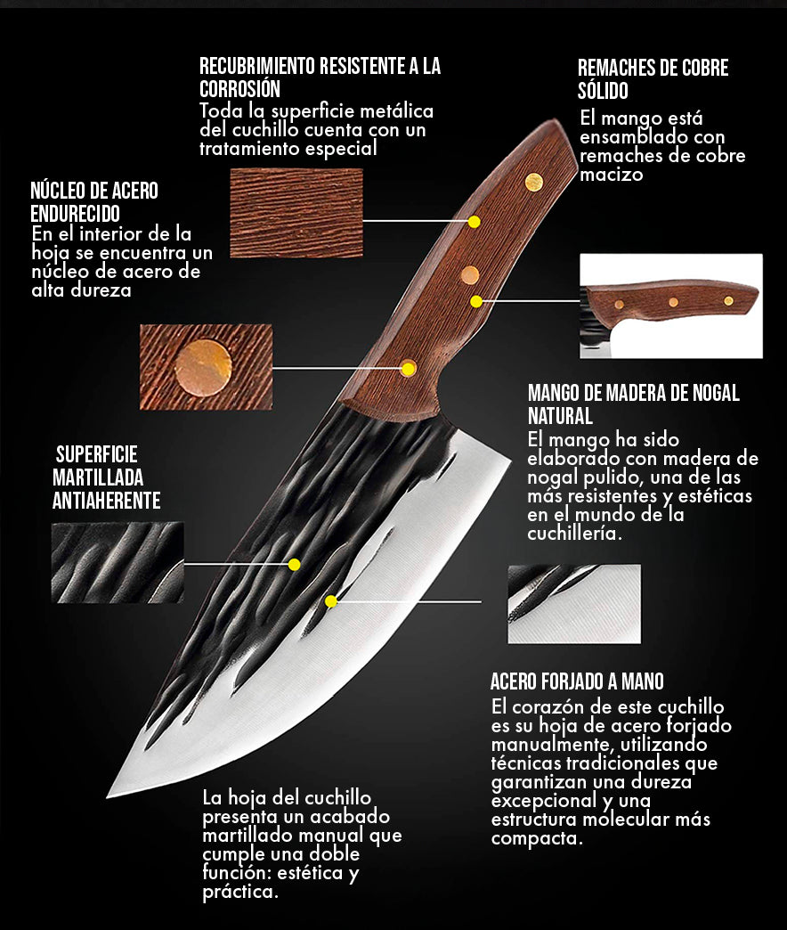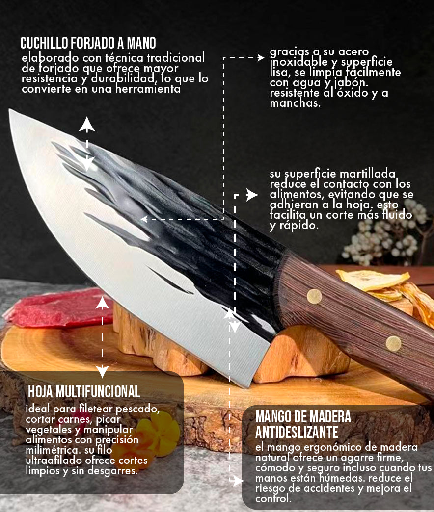 La hoja martillada evita que los alimentos se peguen. obtén cortes limpios y elegantes que elevan cualquier preparación. el mango antideslizante de madera se adapta a tu mano. sentirás el poder y la precisión desde el primer uso.