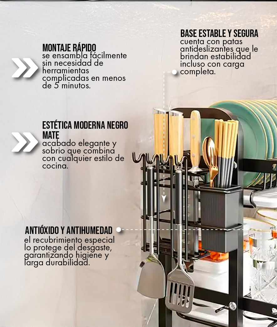 Su diseño de dos niveles te da el doble de capacidad sin ocupar más espacio horizontal. Coloca arriba platos, abajo tazas o utensilios, y aún te sobra lugar. Ideal para familias, cocinas pequeñas o para quienes aman el orden eficiente.
