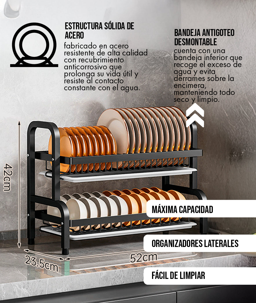 Su diseño de dos niveles te da el doble de capacidad sin ocupar más espacio horizontal. Coloca arriba platos, abajo tazas o utensilios, y aún te sobra lugar. Ideal para familias, cocinas pequeñas o para quienes aman el orden eficiente.