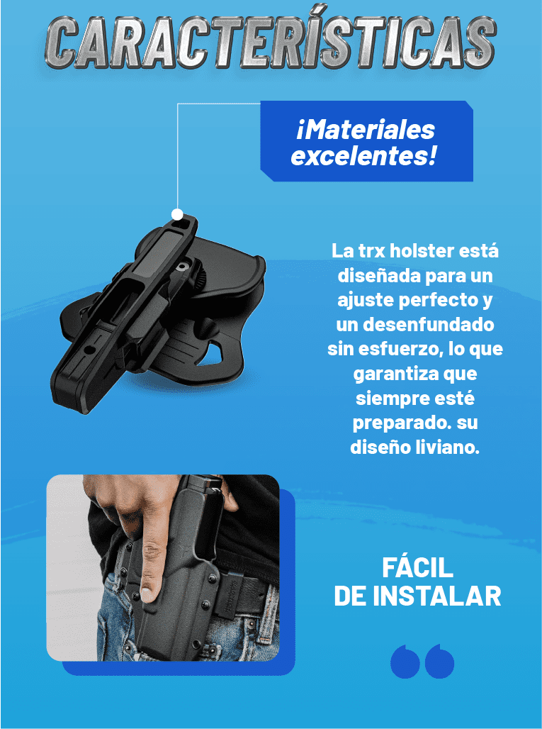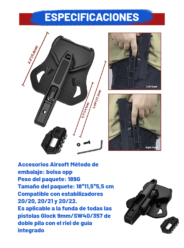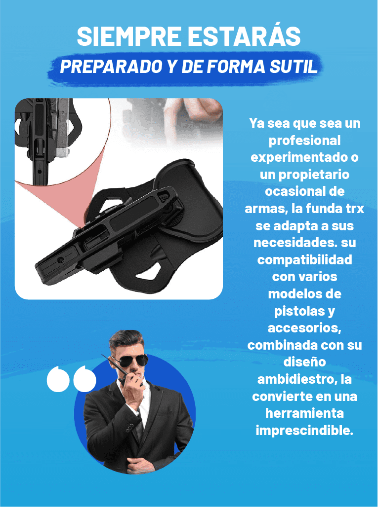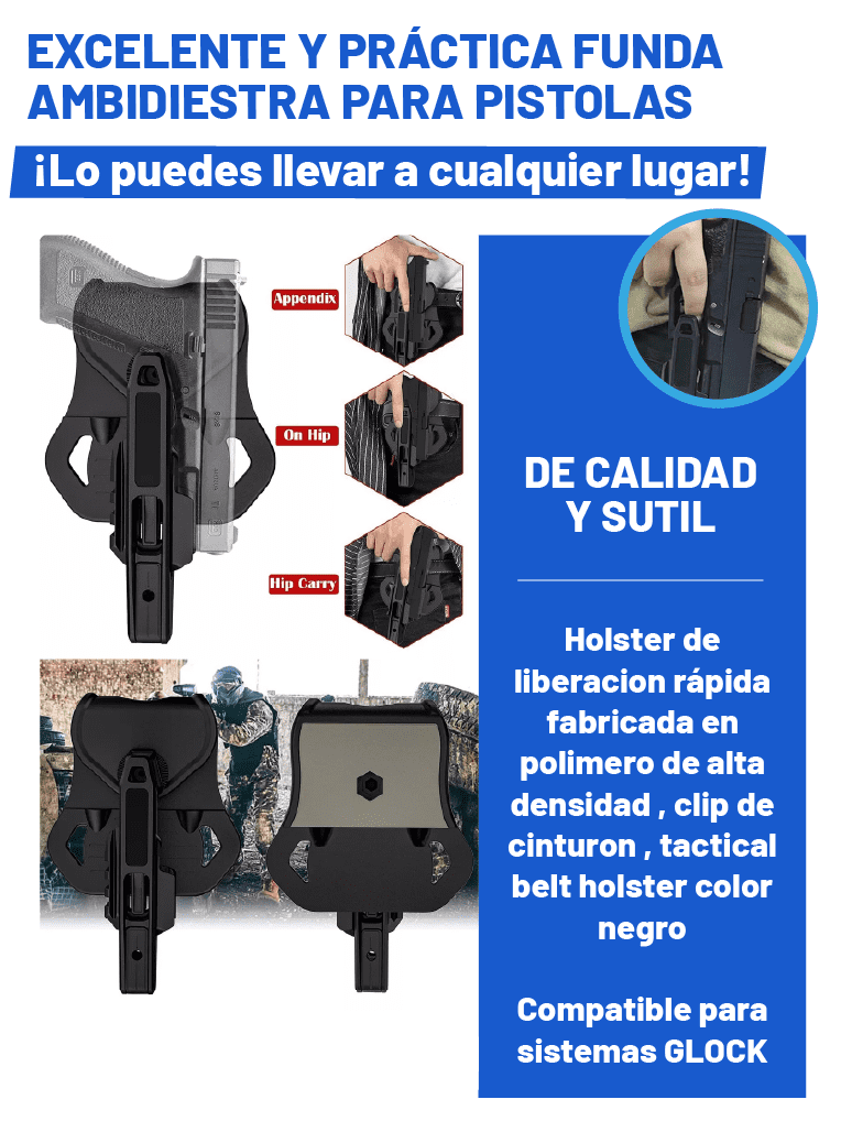 Ideal para agentes de seguridad, escoltas y fuerzas del orden. Defensa personal urbana: Lleva tu arma con seguridad y discreción en ciudad. Entrenamiento táctico: Compatible con prácticas de extracción y defensa. Adaptabilidad máxima: Para cualquier mano, cuerpo y situación.