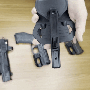 Compatible con múltiples modelos de pistolas compactas y semiautomáticas. 100% ambidiestra. Compatible con pistolas compactas tipo Glock, Beretta, Taurus, etc. Material rígido de polímero con refuerzo lateral