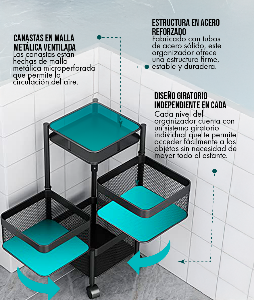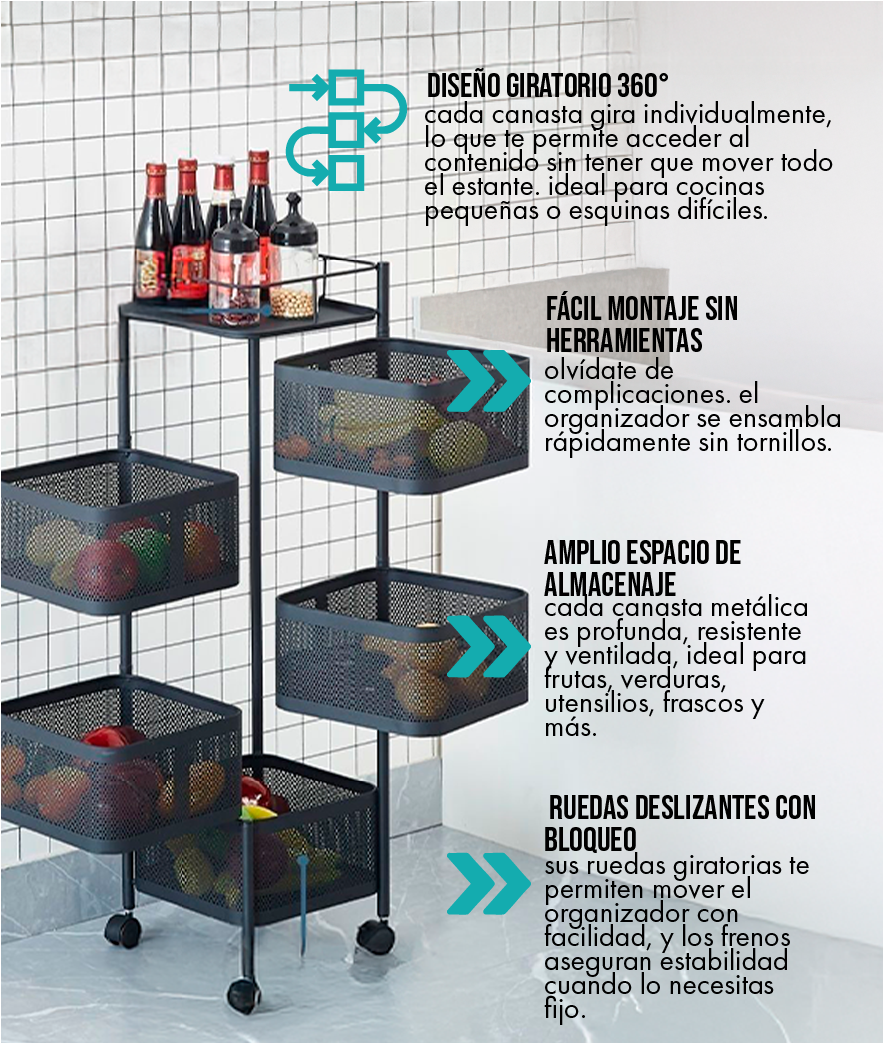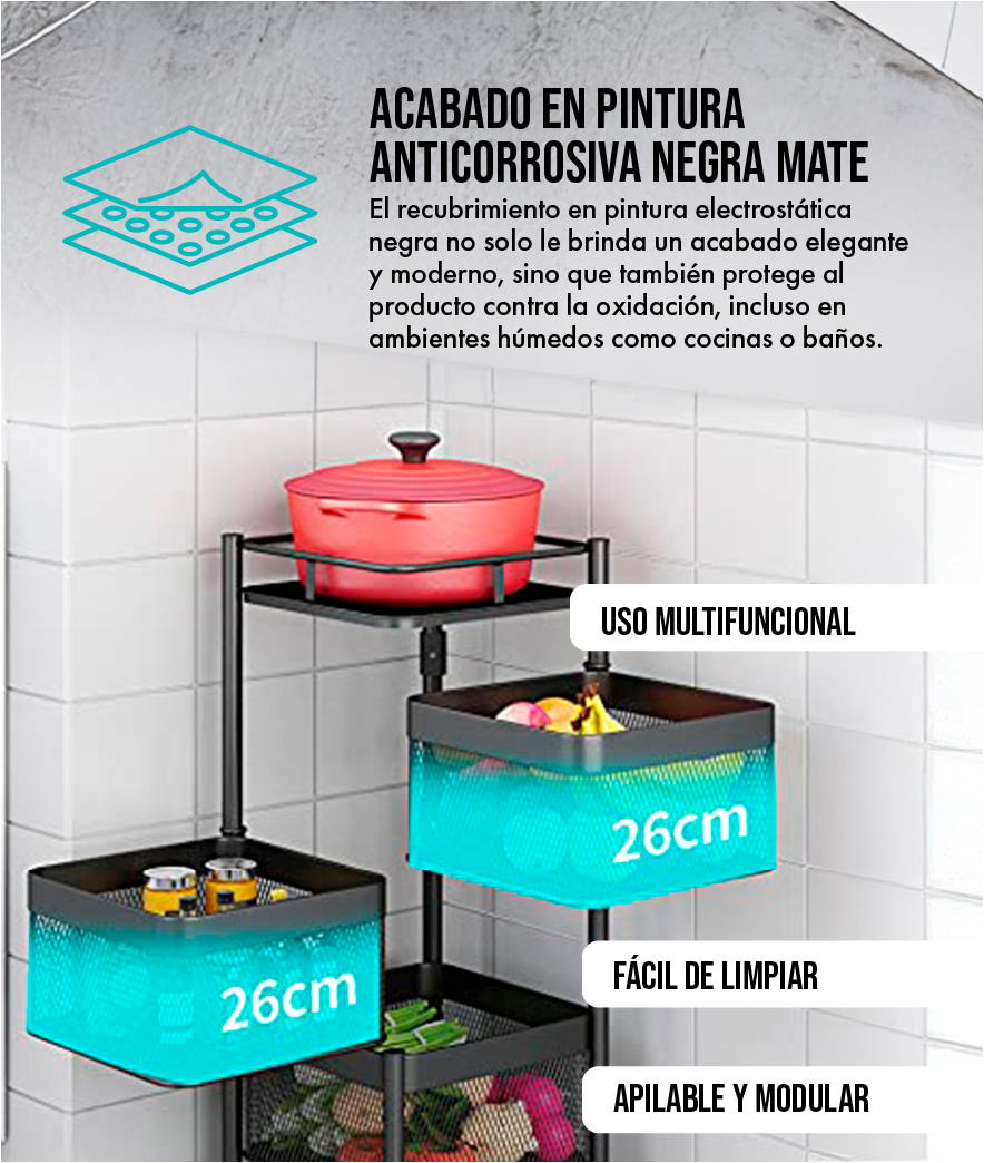 Si sientes que tu cocina es pequeña, este producto fue diseñado pensando en ti. Sus canastas giratorias aprovechan cada centímetro, incluso esas esquinas inútiles. Lo que antes era un rincón desaprovechado, ahora será tu zona de almacenamiento favorita. ¡Convierte lo limitado en funcionalidad pura!