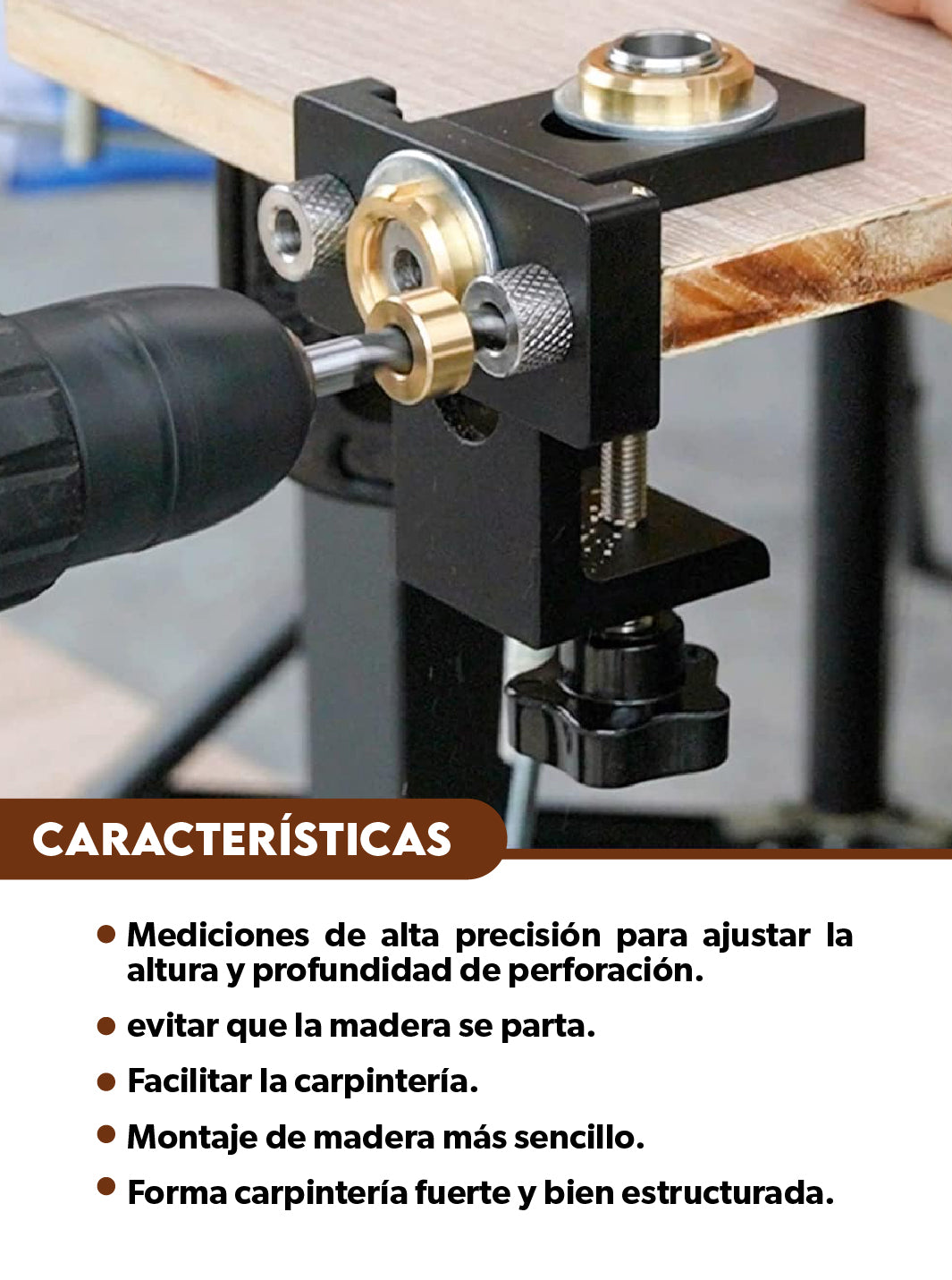 Reduce desperdicio de materiales y mejora tus acabados. Cuerpo de aluminio aeronáutico. Ejes de guía en acero y topes de latón ajustables. Incluye accesorios para taladro y ajuste rápido. Compatible con brocas estándar.