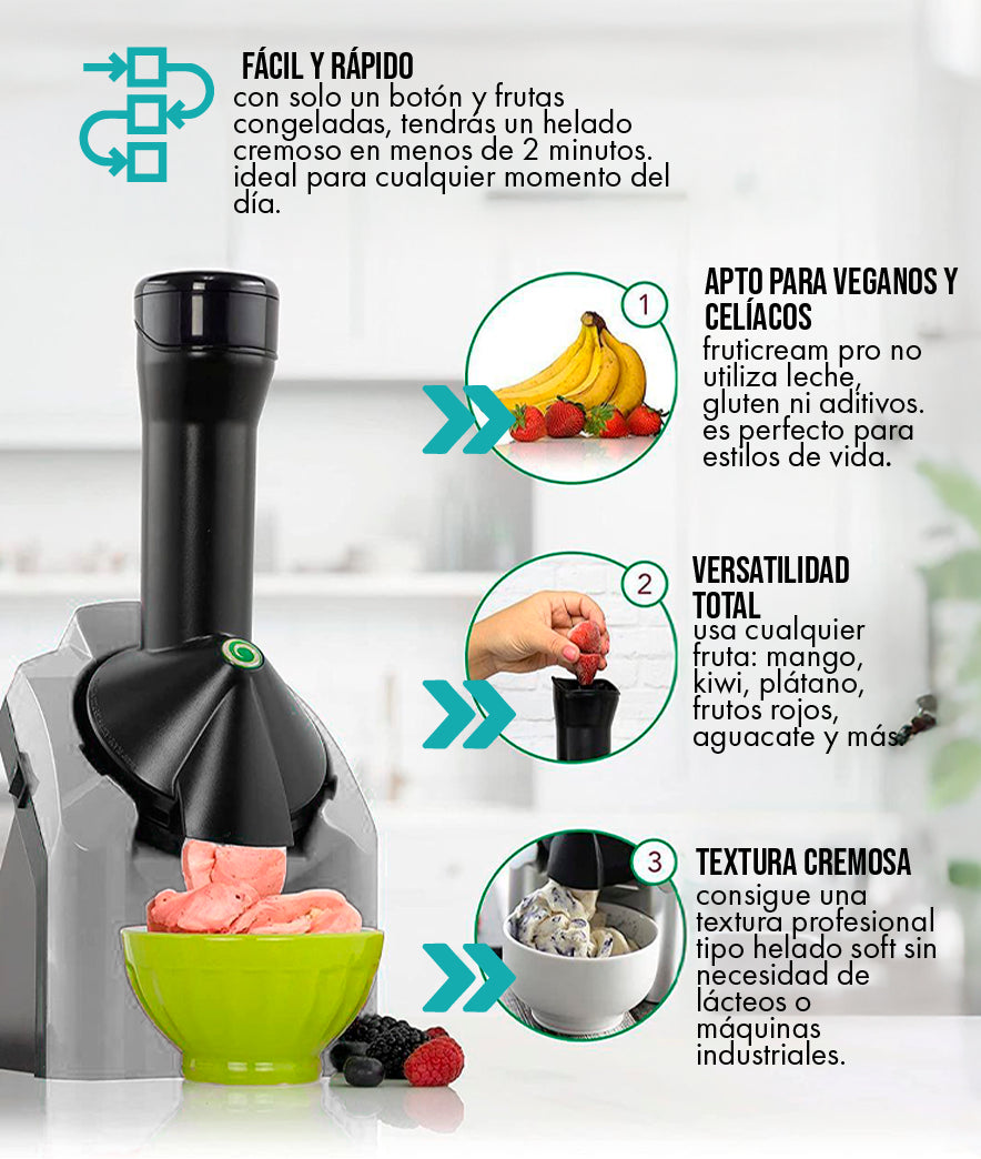 Sabes que esos postres empacados están repletos de ingredientes que no puedes pronunciar. Cada cucharada puede parecer deliciosa, pero tu cuerpo lo siente después. Con FrutiCream Pro, conviertes fruta real en placer real. Sin culpas. Sin excesos.