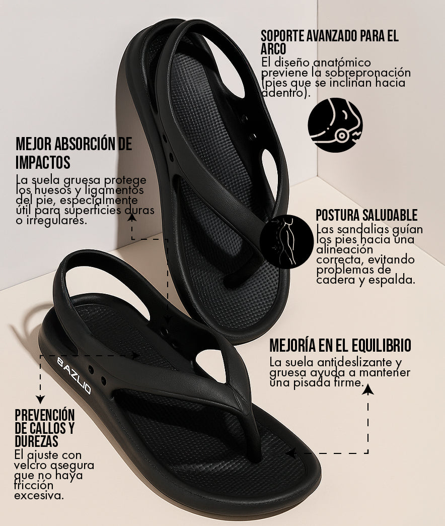 usa las BAZUO y siéntete como si caminaras sobre nubes. Cada paso será alivio puro. combina diseño moderno con beneficios ortopédicos. Una sandalia que cuida de ti.