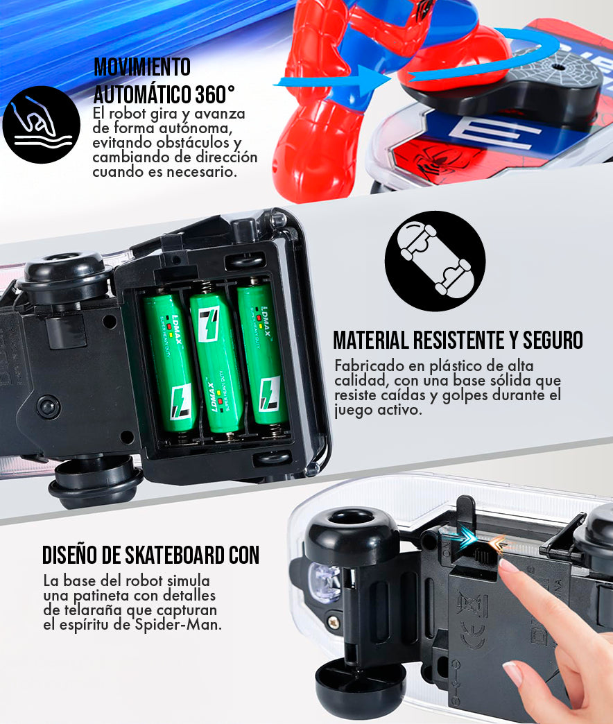 La Patineta Eléctrica Spiderman mantiene su interés con luces, sonido y movimientos automáticos que sorprenden a cada momento. Diversión interactiva por horas con funciones automáticas. Estimula el desarrollo motriz y sensorial del niño.