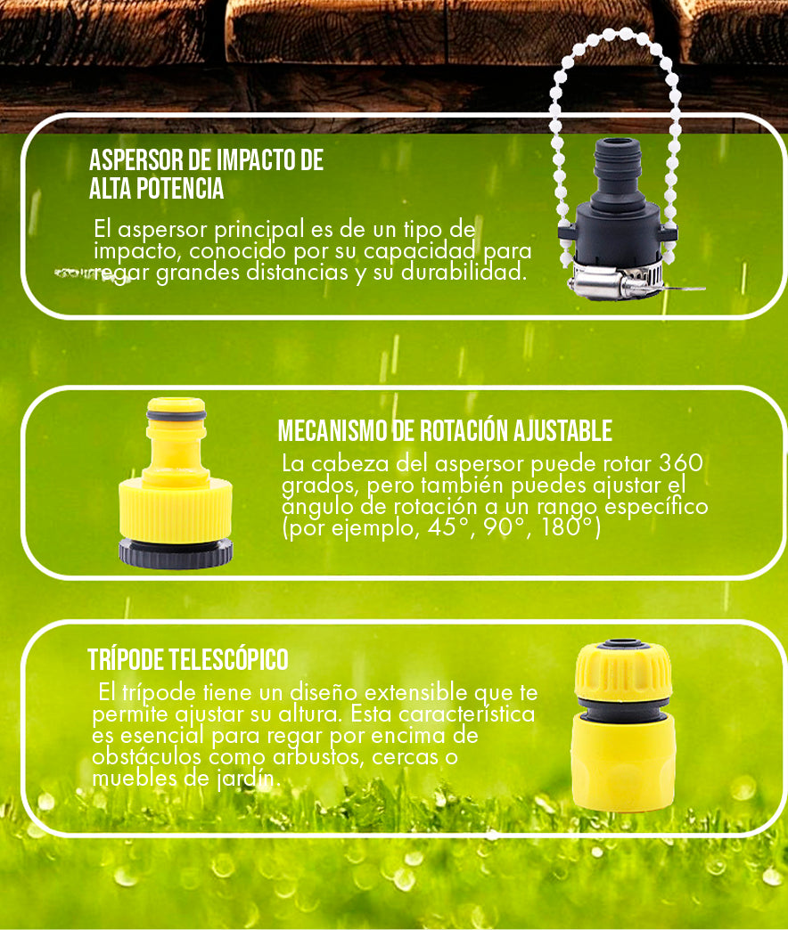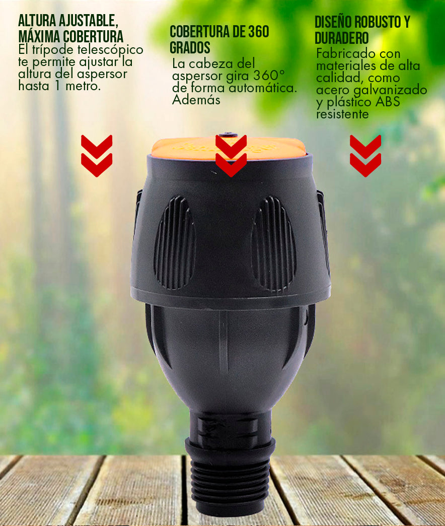 El riego no tiene por qué ser una tarea agotadora y tediosa que te robe tu tiempo libre. Libérate de la esclavitud de la manguera. Instala este aspersor en segundos, relájate en la sombra y deja que el trípode haga el trabajo pesado por ti. ¡Recupera tu tiempo!